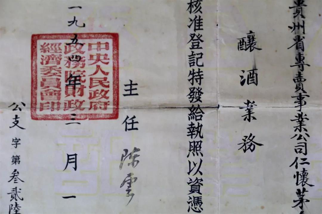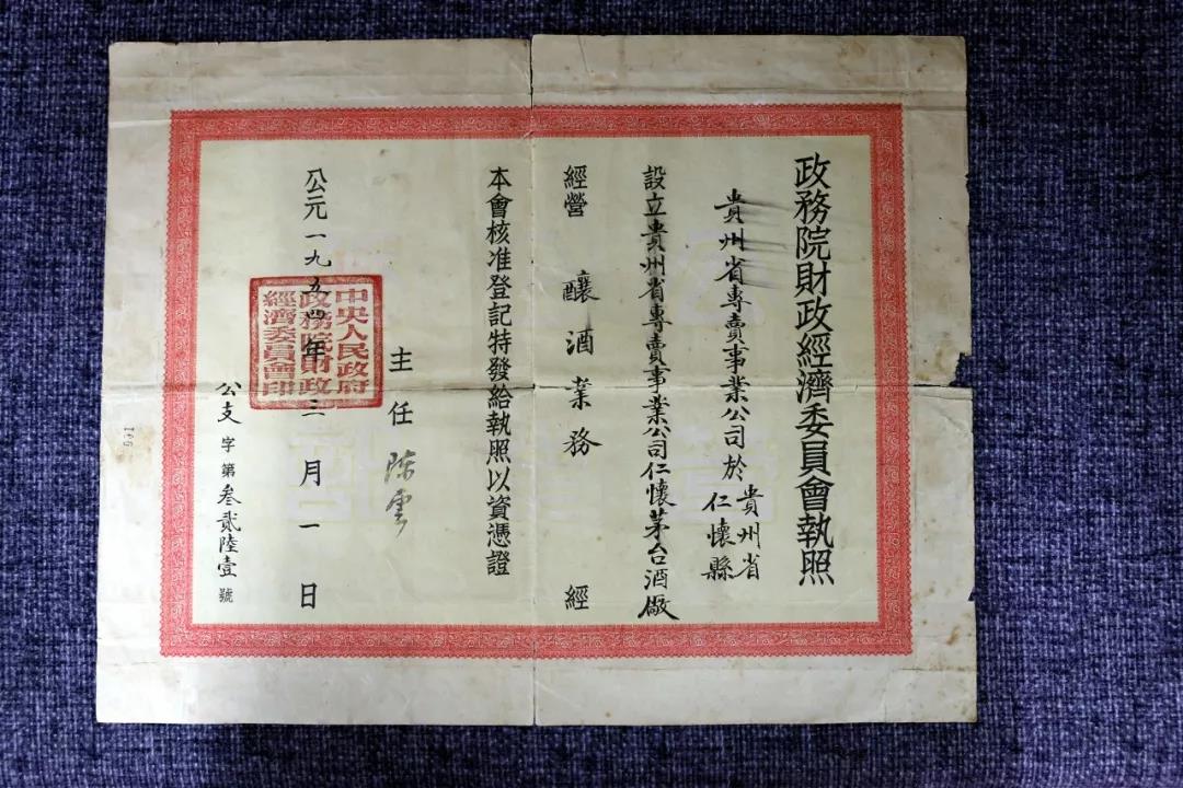 該執(zhí)照為政務(wù)院財(cái)經(jīng)委撤銷前頒發(fā)的為數(shù)不多的執(zhí)照之一,在百?gòu)U待興的解放初期,由政務(wù)院財(cái)經(jīng)委主任陳云給茅臺(tái)酒廠簽發(fā)執(zhí)照,充分體現(xiàn)了中央對(duì)茅臺(tái)酒恢復(fù)生產(chǎn)和發(fā)展的重視和支持,也是茅臺(tái)酒廠的第一份生產(chǎn)經(jīng)營(yíng)執(zhí)照。在茅臺(tái)酒廠歷史發(fā)展進(jìn)程中具有重要的歷史價(jià)值,于2016年被認(rèn)定為二級(jí)文物。