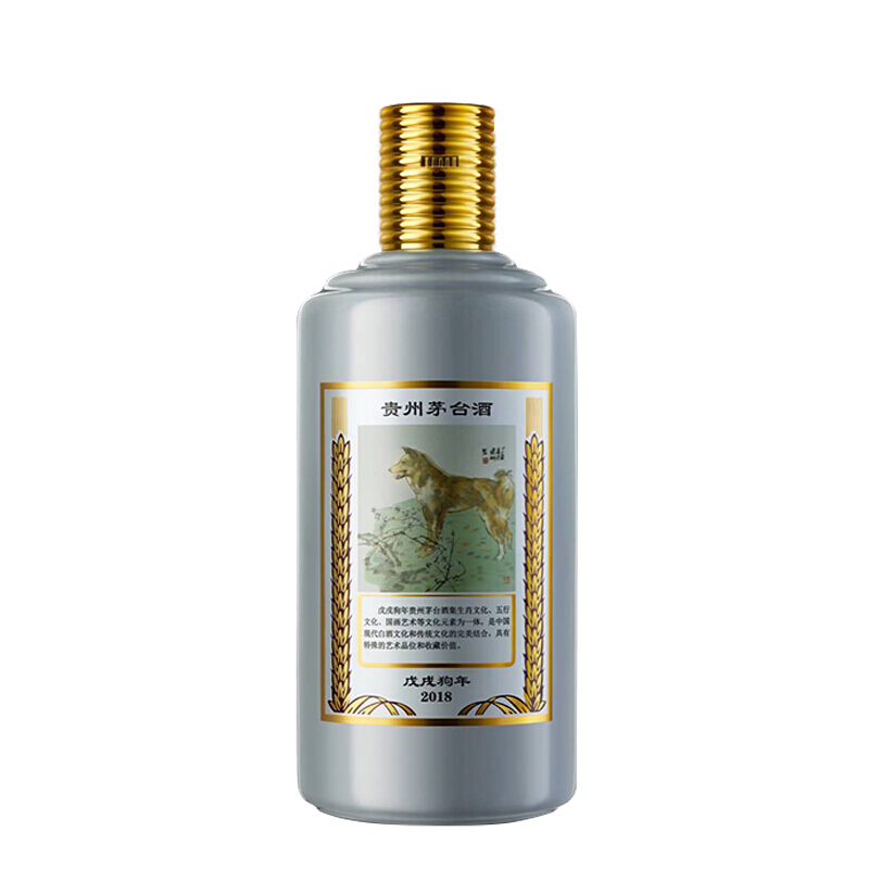 1、戊戌狗年,天干地支為 “ 戊戌 ” 。瓶身背標(biāo)是紀(jì)連彬大師的生肖國畫,茅臺文化與傳統(tǒng)文化的巧妙融合 2、狗的別名是旺財,恰逢2018年,有興財之寓意
